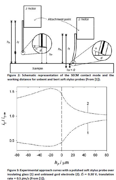 這些柔性探針壓在基體上時(shí)可以彎曲,這樣聚乙烯對(duì)苯二酸酯層一直通過彎曲接觸。這個(gè)聚乙烯對(duì)苯二酸酯層的厚度定義了基體和活性電極區(qū)域的固定工作距離。當(dāng)掃描粗糙表面時(shí),探針的彎曲可以適應(yīng)形貌特征,因此可以不需要額外的電反饋系統(tǒng)(像AFM系統(tǒng)中)保持一個(gè)幾乎固定的工作距離,甚至可以提供那些太粗糙以至于無法AFM成像的表面的圖像[1]。