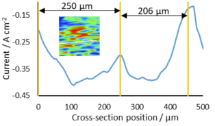 在溶液中的自然活性或偏壓樣品上方會(huì)產(chǎn)生電流。由于iR降,這會(huì)引起活性區(qū)上方的電位梯度。電位梯度的強(qiáng)度與樣品活性和溶液電導(dǎo)率有關(guān)。振動(dòng)探針測(cè)量可以測(cè)量樣品上方的電位梯度,如圖2所示。從局部電位梯度可以確定存在的局部電流密度。