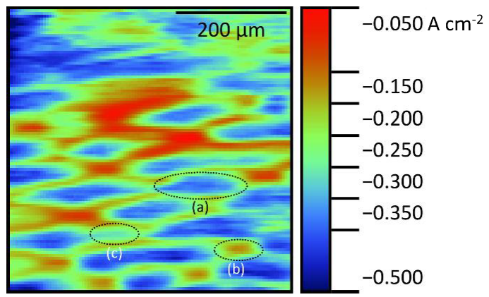 電流密度較高位置可見清晰的類金剛石結(jié)構(gòu)。這些特征與Chorlton[11] 文獻(xiàn)中顯示的上皮細(xì)胞的形狀很匹配。在一些上皮細(xì)胞的基部,較低電流密度的小橢圓形區(qū)域明顯。這些與氣孔有關(guān)。圖上還發(fā)現(xiàn)了一個(gè)可能的未分化細(xì)胞的例子。細(xì)胞外電流的存在是由于植物葉片上的信號(hào),這是由離子調(diào)節(jié)。這種信號(hào)驅(qū)動(dòng)植物保護(hù)細(xì)胞的打開和關(guān)閉,允許氧氣和二氧化碳通過氣孔擴(kuò)散。