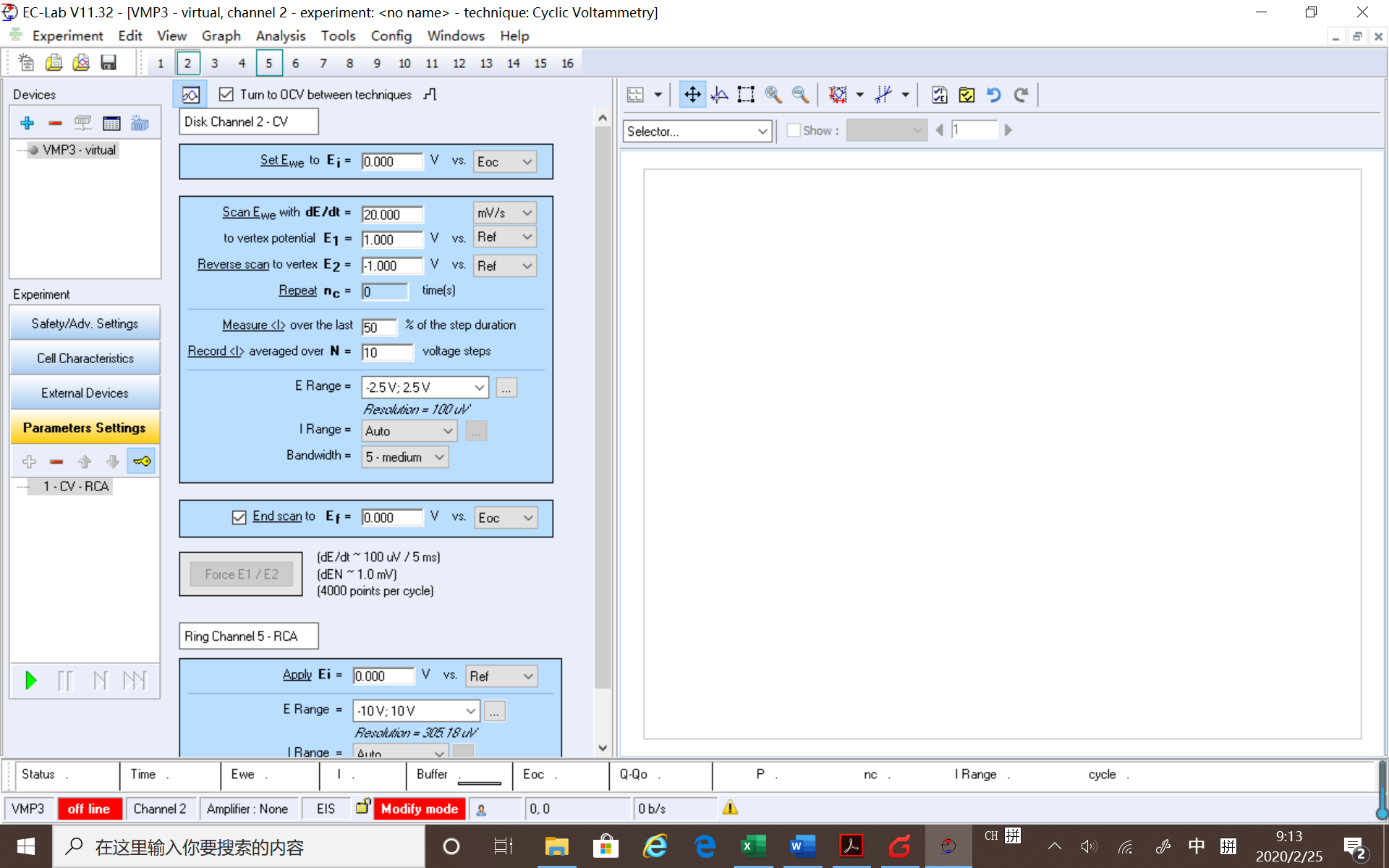 選擇測試技術后,軟件顯示如下的參數設置頁面。下圖為選擇CV-CA技術后的參數設置頁面,其中的參數設置與單獨的CV和CA測試相同。
