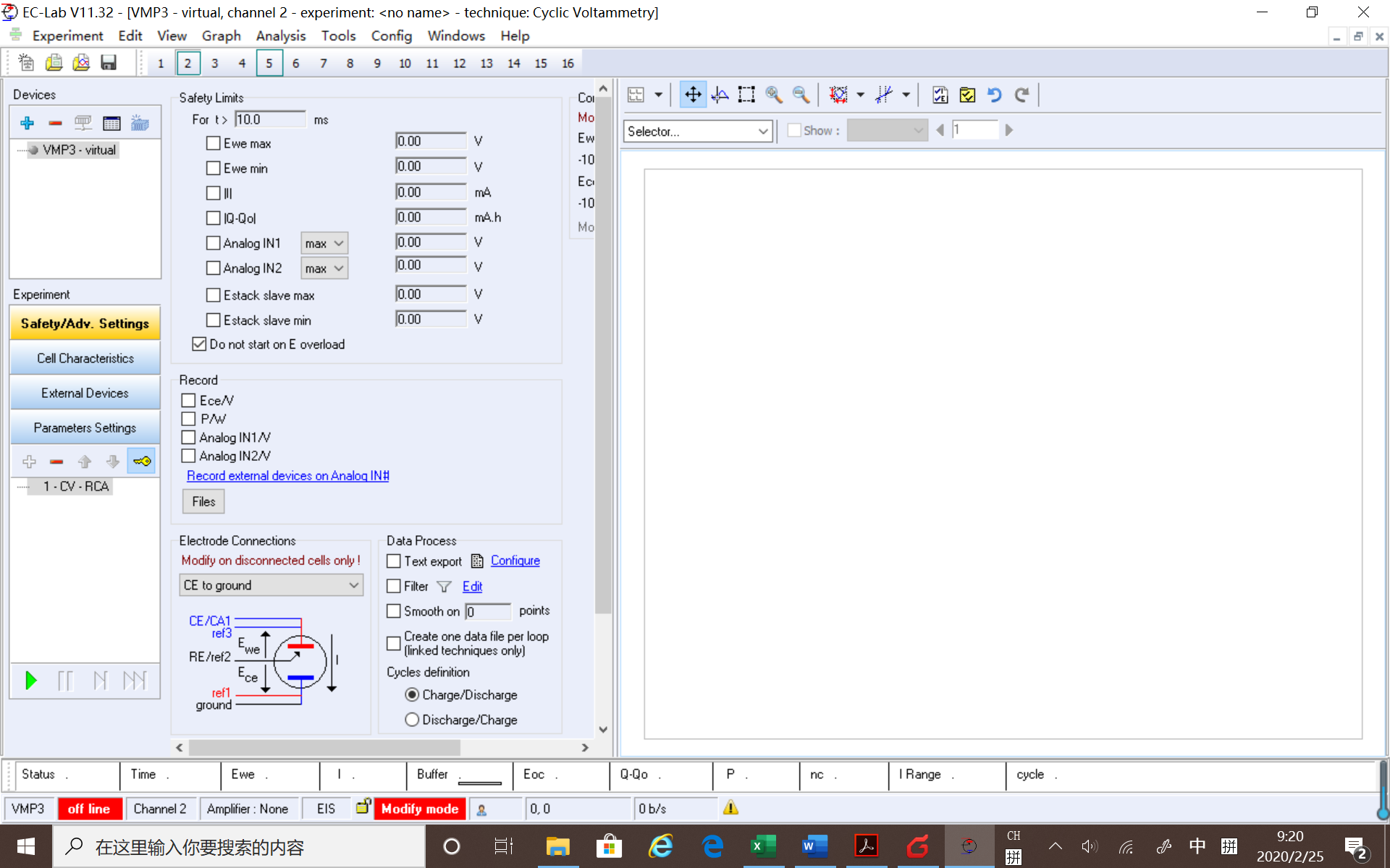 EC-Lab軟件中,左側Experiment中,選擇“Safety/Adv. Settings”,其中的Electrode Connections下,接線模式選擇“CE to Ground”模式,如下圖。按照圖示進行連線:CA1(紅色)和ref3(紅色)兩條線連工作電極,ref2(白色)連參比電極,ref1(藍色)和ground(黑色)兩條線連輔助電極。(注意其連線方式與普通的三電極連線方式不同,一定要仔細對照圖片進行連線。)