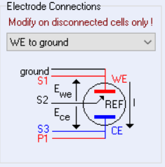 EC-Lab軟件中,添加實驗后,在左側Safety/Adv. Settings下有一個Electrode Connections部分,其中可以選擇standard、CE to ground、WE to ground或者其他大電流儀器的連接方式(如下圖)。