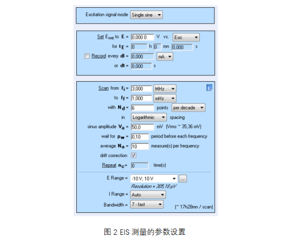 為了在R/C或R+C中選擇合適的等效電路,需要在較寬的頻率范圍(即3 MHz至1 mHz)上進(jìn)行EIS測量。設(shè)置如圖2所示。