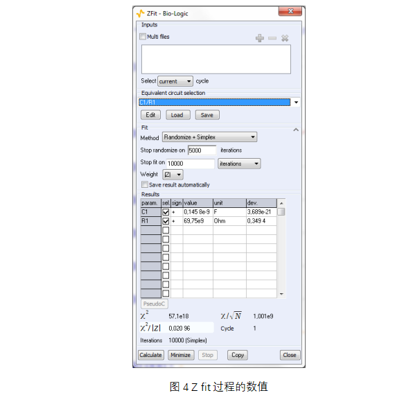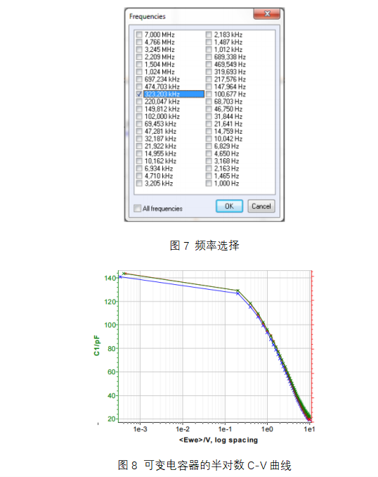 SPEIS7MHz-1Hz允許用戶使用Zfit工具在不同頻率下擬合電容值C1(頻率選擇窗口如圖7所示)。圖8中的C1與實驗中已經(jīng)計算的Cp值進(jìn)行了比較。C1和Cp在低電壓下的值約為140 pF,在高電壓下的值約為20 pF。因此,比較表明,用Zfit計算的C1和直接在EIS技術(shù)中確定的Cp是相同的。