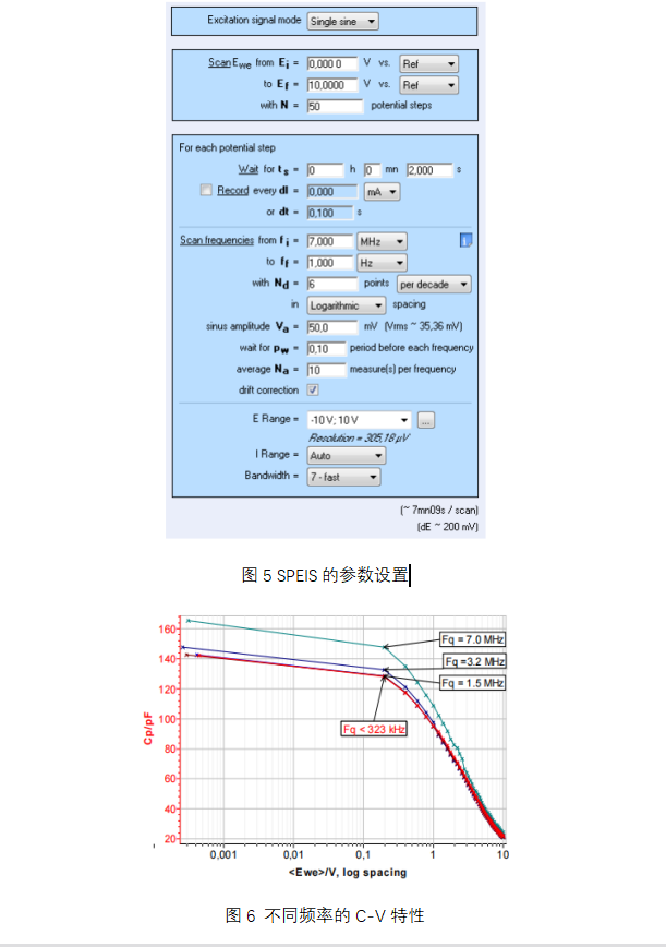 采用了兩種SPEIS技術(shù)。一個在7 MHz到1 Hz的頻率范圍內(nèi)(設(shè)置如圖5所示),另一個在一個頻率下(設(shè)置與圖5所示類似,fi等于ff)。在323 kHz的頻率下進(jìn)行測量,因為在該頻率以上,可變電容器的響應(yīng)取決于頻率(圖6)。這些實驗分別命名為SPEIS7MHz 1Hz和SPEIS323kHz。電壓掃描從0 V開始,以200 mV的步長上升到10 V。