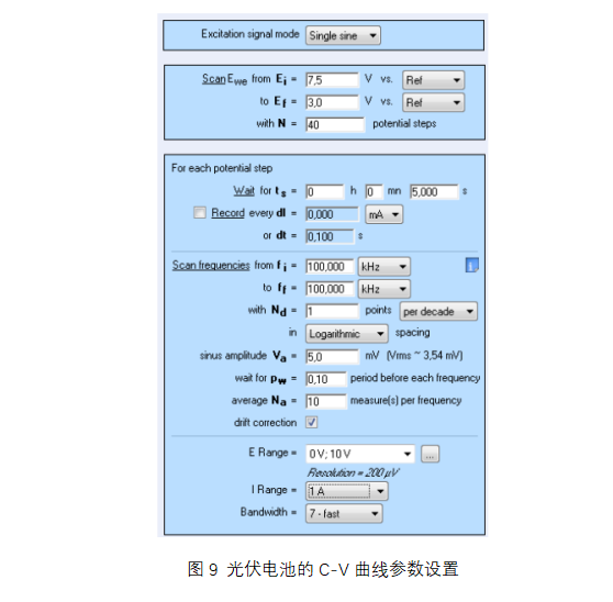 使用配備超低電流選項的SP-200或SP-300和EC Lab?軟件進(jìn)行研究。對于這兩個系統(tǒng)(即varia電容器和光伏電池),采用標(biāo)準(zhǔn)的雙電極連接進(jìn)行了研究。