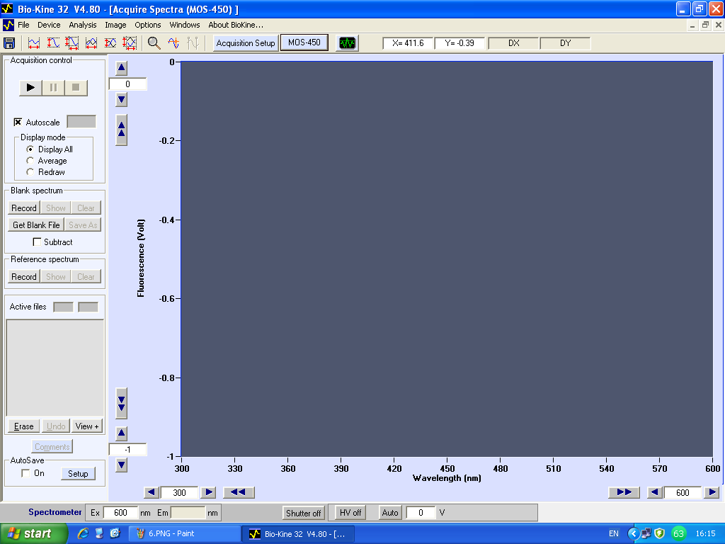 1.空白的測量。將裝有待測樣品的空白(如水或緩沖鹽)的石英比色池放入樣品室,蓋上蓋子(所用的石英池必須經過徹底的清洗,如有殘留物將會干擾測試結果)。點擊圖2主界面Blank spectrum區域的Record按鈕,進行空白譜掃描,空白譜以白色虛線的形式顯示在主界面中。在測好空白譜的基礎上勾選Subtract復選框,這個選項的功能是軟件將在下一步樣品的測量中自動扣除空白。另外,通過點擊save as按鈕可以將空白譜保存成文件。